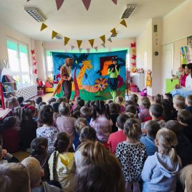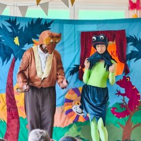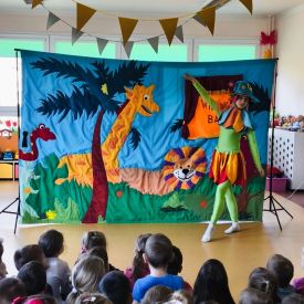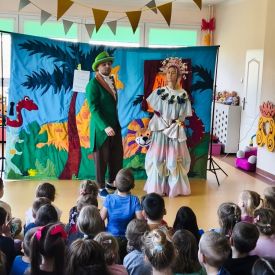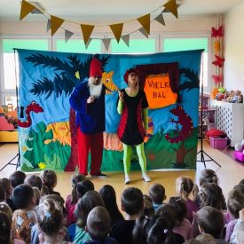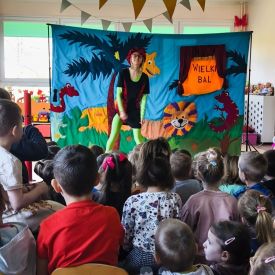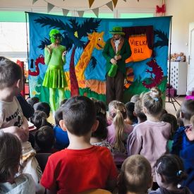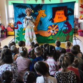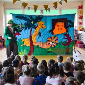 Na zakończenie tygodnia obejrzeliśmy wyjątkowy występ teatralny pt. "Bal u Królowej Kwiatów" , który dostarczył dzieciom wiele radości i niezapomnianych wrażeń. Przedstawienie opowiadało historię sympatycznego świerszcza, który wyruszył na poszukiwanie partnerki na bal.