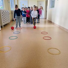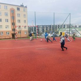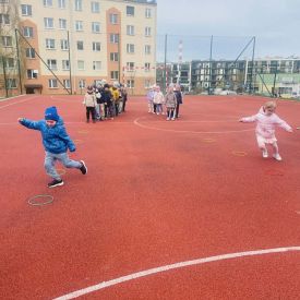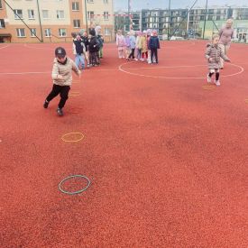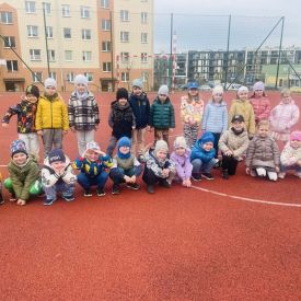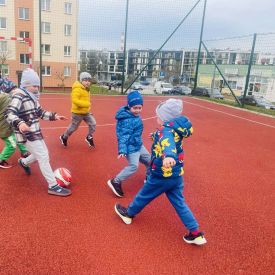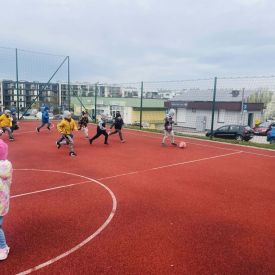 W ramach obchodów dzieci wybrały się również na pobliskie boisko, gdzie mogły aktywnie spędzić czas na świeżym powietrzu. Przedszkolaki chętnie wykonywały różne ćwiczenia ruchowe, a największą radość sprawiły im gry zespołowe, szczególnie gra w piłkę nożną oraz piłkę ręczną.