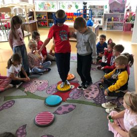 Na początku zajęć wspólnie wysłuchaliśmy piosenki Przedszkole, To Rodzina – słowa Marii Tomaszewskiej. Tworzyliśmy wspólny krąg, świetnie się bawiliśmy z wykorzystaniem chusty animacyjnej.