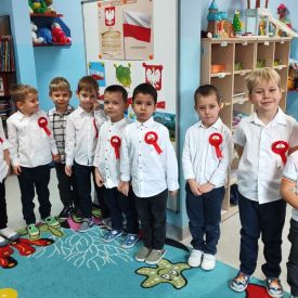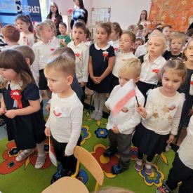 11 listopada to wyjątkowy dzień dla każdego Polaka. Z tej okazji dzieci z grupy Niezapominajki przygotowały wzruszające przedstawienie patriotyczne, podczas którego w piękny sposób uczciły pamięć o bohaterach walczących o wolność naszej Ojczyzny. Uroczystość rozpoczęła się wspólnym odśpiewaniem hymnu narodowego w ramach ogólnopolskiej akcji „Szkoła do hymnu”. Całe przedszkole z dumą i powagą włączyło się w to ważne wydarzenie. Następnie przedszkolaki zaprezentowały występ artystyczny, w którym nie zabrakło wierszy, piosenek patriotycznych oraz tańca z biało-czerwonymi flagami do utworu „Polskie drogi”. Występ ten dostarczył wszystkim obecnym wielu wzruszeń. Na zakończenie dzieci zaprezentowały radosny taniec do piosenki „Tańczymy dziś dla Polski”, który wprowadził wszystkich w pogodny, świąteczny nastrój. Po części artystycznej rodzice i kadra przedszkola wspólnie z dziećmi zaśpiewali znane pieśni patriotyczne, tworząc piękną, międzypokoleniową atmosferę. Nie zabrakło również quizu „Rodzice kontra dzieci”, który dostarczył wielu emocji i dobrej zabawy. Na zakończenie spotkania rodzice otrzymali biało-czerwone serduszka, na których zapisali swoje życzenia dla Niepodległej. To był wyjątkowy, pełen dumy i radości dzień, który na długo pozostanie w pamięci całej społeczności przedszkola.