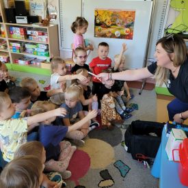 Spotkanie było również okazją, by wzbogacić i utrwalić swoje wiadomości na temat sposobów dbania o zdrowie. Dzieci dowiedziały się, co warto jeść i w jaki sposób ćwiczyć, by być pełnym energii. Na zakończenie przedszkolaki dostały kolorowankę przedstawiająca Panią pielęgniarkę oraz rekwizyty związane z jej pracą.