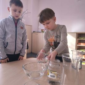 🧪 Czarowaliśmy z objętością, przelewaliśmy wodę, by sprawdzić, czy w wąskim wazonie płynu jest tyle samo, co w płaskiej misce. 🔍 Tropiliśmy figury – z magicznymi lupami w ręku szukaliśmy kwadratów i kół ukrytych w naszej sali.