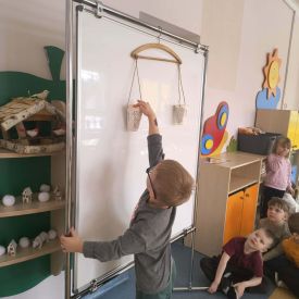 ⚖️ Ważyliśmy na wieszaku sprawdzaliśmy, czy 4 woreczki są cięższe niż 5 piłeczek.