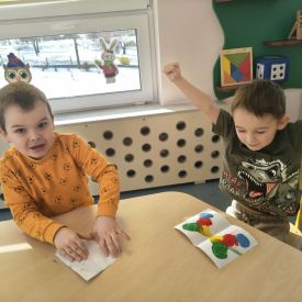 🦋 Magia symetrii na zakończenie - bawiliśmy się farbami; dzięki odbijaniu wzorów na złożonej kartce, w naszych dłoniach „ożyły” przepiękne, idealnie symetryczne motyle!