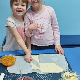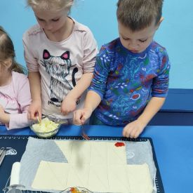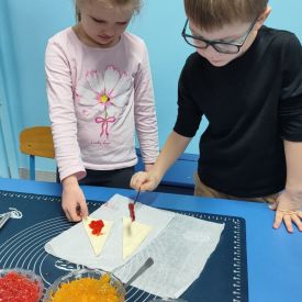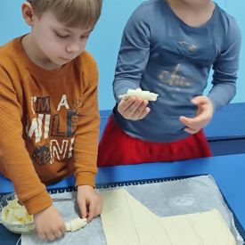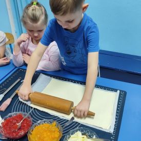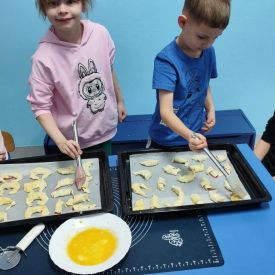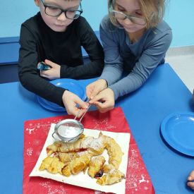 Z okazji Dnia Rogalika nasze przedszkolaki uczestniczyły w zajęciach kulinarnych. Po umyciu rąk i przygotowaniu produktów dzieci, z pomocą pań, wałkowały ciasto, nakładały dżem i jabłka oraz formowały rogaliki. Gotowe ciasteczka trafiły do kuchni, gdzie po upieczeniu zostały posypane cukrem pudrem. Po pracy przyszedł czas na zasłużony poczęstunek. Rogaliki były pyszne i bardzo szybko zniknęły z talerzyków. Była to słodka uczta i świetna okazja do rozwijania zainteresowań kulinarnych oraz utrwalania zasad higieny podczas przygotowywania posiłków.