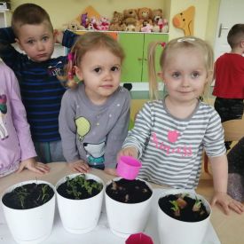 Chcąc przyspieszyć przyjście wiosny maluchy postanowiły założyć w sali ,,zielony ogródek" .