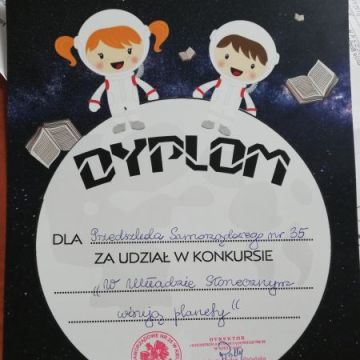 Dyplom dla Przedszkola Samorządowego nr 35 za udział w konkursie recytatorskim "W świecie wierszy Jana Brzechwy"