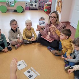 W pierwszych dniach nowego roku mieliśmy przyjemność gościć dwie mamy, które przygotowały dla dzieci ciekawe i wartościowe spotkania czytelnicze. Mama Alka zaprezentowała dzieciom dwie pozycje literackie: książkę „Skwaszone winogrono” autorstwa Jory’ego Johna i Pete’a Oswalda oraz rymowanki z książki „Wpadła gruszka do fartuszka” (praca zbiorowa). Utwory wzbudziły duże zainteresowanie wśród dzieci, zachęcały do uważnego słuchania, rozwijały wyobraźnię oraz poczucie humoru.