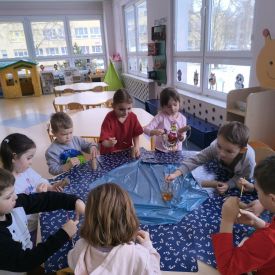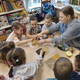 Największą frajdę sprawiło nam jednak działanie praktyczne! Samodzielnie przygotowaliśmy pożywne kule z ziaren i smalcu, które następnie dumnie zawiesiliśmy na drzewach w ogrodzie i okolicy przedszkola. Teraz z zaciekawieniem obserwujemy przez okna, czy pierzaści goście już korzystają z poczęstunku. To była lekcja empatii i odpowiedzialności, którą nasze przedszkolaki zdały na szóstkę!