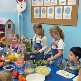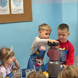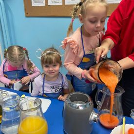 Nasze Różyczki po raz kolejny wykazały się kreatywnością i dbałością o zdrowie! Dzieci przygotowały pyszne, naturalne soki z kolorowych owoców i warzyw, korzystając z blendera kielichowego. Przed rozpoczęciem pracy pamiętały również o higienie — dokładnie umyły ręce, aby przygotować zdrowe, naturalne kompozycje smakowe.