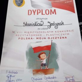 Staś J. z grupy „Bratki” wziął udział w VIII Międzyszkolnym Konkursie Recytatorsko-Plastycznym „Polska – Moja Ojczyzna” w Szkole Podstawowej nr 28 w Kielcach. Pięknie zaprezentował wybrany utwór o tematyce patriotycznej oraz wykonał własną, pomysłową pracę plastyczną. Konkurs przebiegał w atmosferze szacunku dla wartości narodowych i dostarczył uczestnikom wielu pozytywnych emocji.