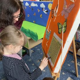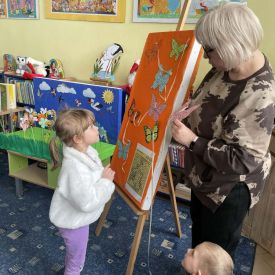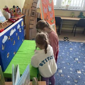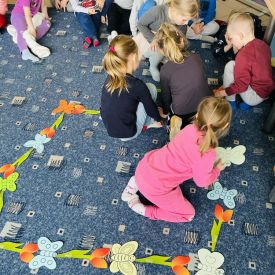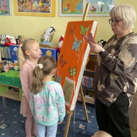 W trakcie zajęć dzieci wzięły również udział w działaniach plastycznych i twórczych. Wspólnie stworzyły makietę przedstawiającą wiosenną łąkę pełną kolorowych kwiatów i motyli. Przedszkolaki przygotowały także wyjątkowy „Szalik Pani Wiosny”, ozdabiając go kwiatami oraz motylami.