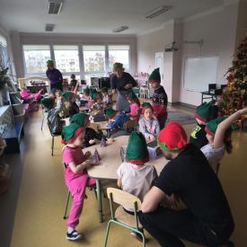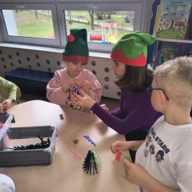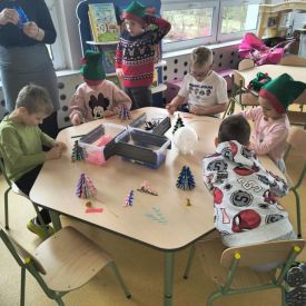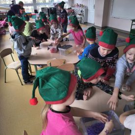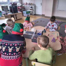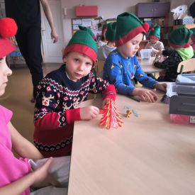 W warsztatach aktywnie uczestniczyli również chłopcy – Tymon i Kajetan – którzy chętnie pomagali i wspierali rówieśników. W świątecznych sweterkach prezentowali się uroczo, podobnie jak cała grupa, która dodatkowo otrzymała od rodziców czapeczki.