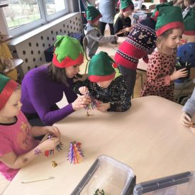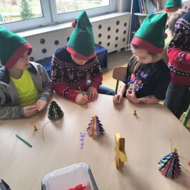 Po części pokazowej przedszkolaki przystąpiły do twórczej pracy przy stolikach. Z przygotowanych wcześniej przez nich elementów – również wydrukowanych w 3D – składały własne, kolorowe choinki!!! Do każdej choineczki dzieci otrzymały małe światełka, dzięki czemu ich prace nabrały prawdziwie świątecznego blasku. Na koniec każdy mógł również podpisać się na specjalnej tablicy z Mikołajem, którą rodzice sami wykonali na drukarce 3D i pozostawili nam jako piękną pamiątkę.