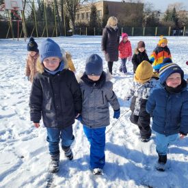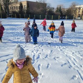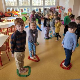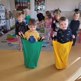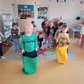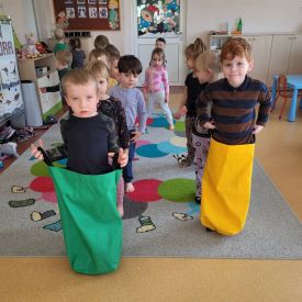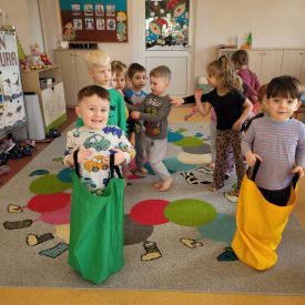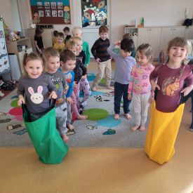Dużo radości sprawiają przedszkolakom również zabawy w workach, w których dzieci skaczą obunóż, doskonaląc równowagę i wzmacniając mięśnie nóg. Przedszkolaki pamiętają także o codziennej dawce ruchu na świeżym powietrzu – chętnie wychodzą na dwór, gdzie mogą bawić się i aktywnie spędzać czas.