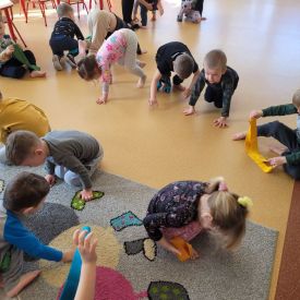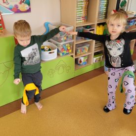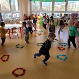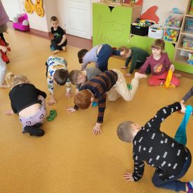 Dzieci z grupy Fiołki chętnie uczestniczą w zajęciach ruchowych, podczas których rozwijają swoją sprawność fizyczną oraz koordynację ruchową. Podczas zabaw wykorzystują różnorodne przybory, m.in. kolorowe szarfy, worki, które uatrakcyjniają ćwiczenia i zachęcają do aktywności.