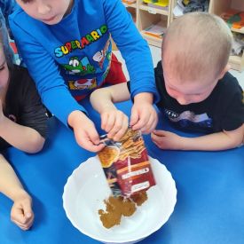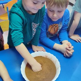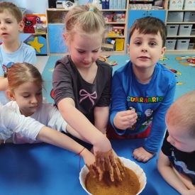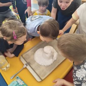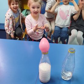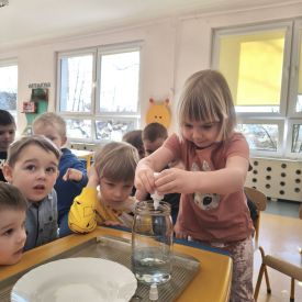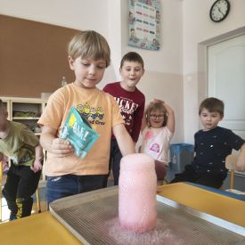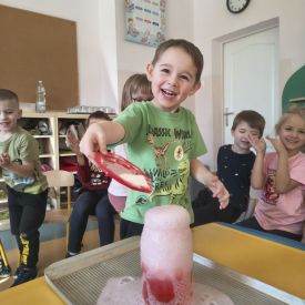 W tym tygodniu sale grup Niezapominajki oraz Różyczki zamieniły się w prawdziwe laboratoria naukowe! Nasze przedszkolaki odłożyły na bok zabawki, by założyć niewidzialne gogle naukowców i wyruszyć w fascynującą podróż do świata chemii i fizyki. Z ogromną ciekawością sprawdzaliśmy, jak reagują ze sobą proste składniki, które każdy z nas ma w kuchni. W ruch poszły: