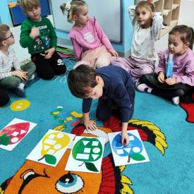 Po wysłuchaniu opowiadania dzieci aktywnie uczestniczyły w rozmowie kierowanej, podczas której nazywały poznane figury, opisywały ich kształty oraz wskazywały je w najbliższym otoczeniu.