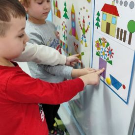 Na zakończenie zajęć dzieci wykonały pracę plastyczną, polegającą na tworzeniu własnego miasteczka z figur geometrycznych. Praca rozwijała wyobraźnię, kreatywność oraz sprawność manualną, a także utrwalała zdobyte wiadomości matematyczne.
