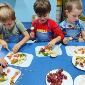 Podczas wspólnej pracy dzieci utrwalały nazwy owoców, rozwijały sprawność manualną oraz uczyły się zasad zdrowego odżywiania. Gotowe szaszłyki wyglądały kolorowo i smakowały wyśmienici