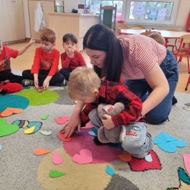 Kolejnym zadaniem było łączenie w pary serduszek przeciętych na pół, co sprzyjało współpracy i integracji w grupie. Następnie przedszkolaki odbijały swoje kciuki w walentynkowym serduszku, tworząc wyjątkową i pełną miłości pracę plastyczną.