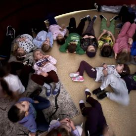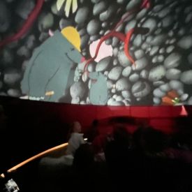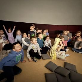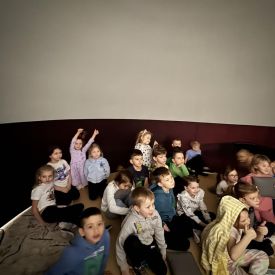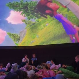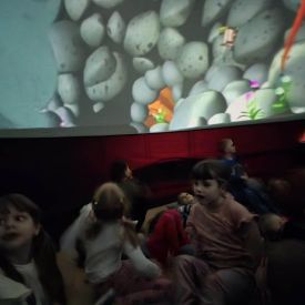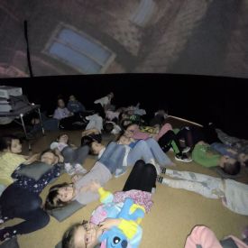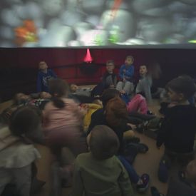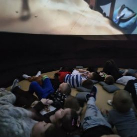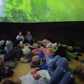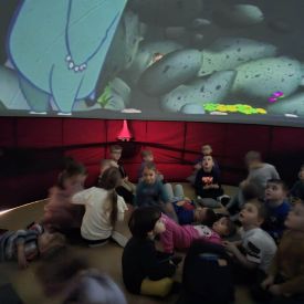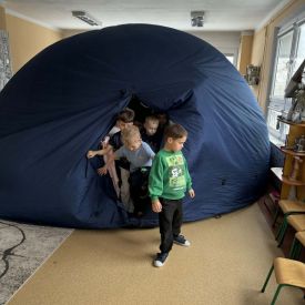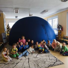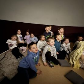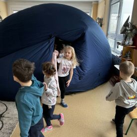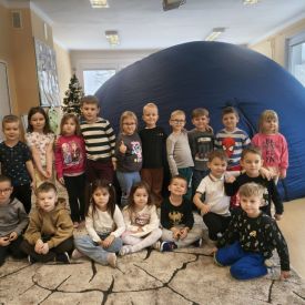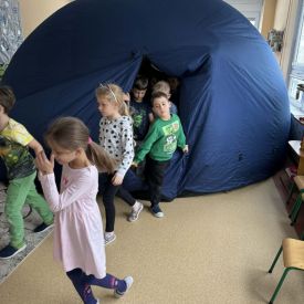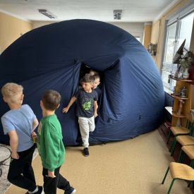 W dniu 16.01.2026r. w naszym przedszkolu gościła Akademia Edukacyjna, która zaprosiła dzieci do niezwykłego świata mobilnego planetarium-kina sferycznego. Dzięki specjalnej kopule dzieci mogły obejrzeć filmy w formie projekcji sferycznej, która otaczała je ze wszystkich stron. Taka forma seansu pozwoliła dzieciom poczuć się jak uczestniczy prawdziwej podróży i z dużym zainteresowaniem śledzić prezentowane treści.