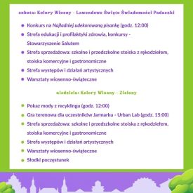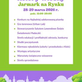 serdecznie zapraszamy do udziału w Jarmarku „Kolory Wiosny”, który odbędzie się na kieleckim rynku w dniach 28–29 marca 2026 roku. W programie przewidziano wiele atrakcji oraz zabaw dla dzieci i całych rodzin.