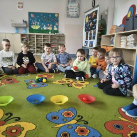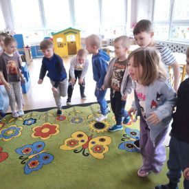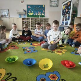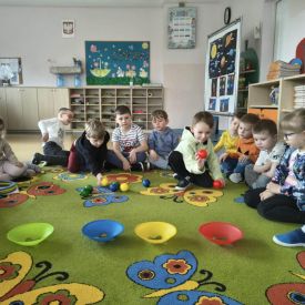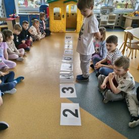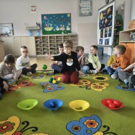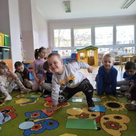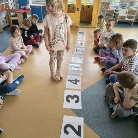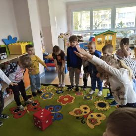 Nasza sala zamieniła się w planszę do gry. Dzieci: przeliczały do 10, przemieszczając się po wyznaczonych polach o określoną liczbę kroków, trenowały celność i liczenie, wrzucając kolorowe piłeczki do odpowiednich pojemników, wykonywały ćwiczenia gimnastyczne (pajacyki, przysiady, skoki), a o liczbie powtórzeń decydował rzut wielką kostką do gry.
