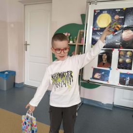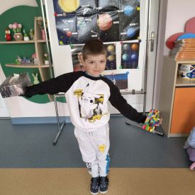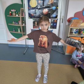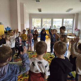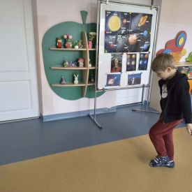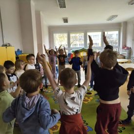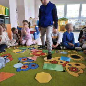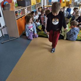 Matematyka to także mierzenie i ważenie, co sprawdziliśmy w praktyce: mierzenie odległości za pomocą kroków. Sprawdzaliśmy, ile kroków dzieli dywan od drzwi sali. Okazało się, że każdy wynik jest inny, co stało się wstępem do rozmowy o jednostkach miary! Dzieci zamieniły się w ludzkie szalki wagowe. Trzymając przedmioty w dłoniach, oceniały ich ciężar i sprawdzały, co przeważa szalę. Na zakończenie zajęć czekała na nas dawka gimnastyki połączonej z utrwalaniem kształtów. Twister z figur geometrycznych wywołał mnóstwo śmiechu – postawienie stopy na niebieskim trójkącie, a dłoni na żółtym kole okazało się nie lada wyzwaniem dla naszej koordynacji! Poprzez takie zajęcia dzieci widzą, że matematyka jest wszędzie wokół nas w ruchu, w sporcie i w codziennych czynnościach. To była wspaniała lekcja logicznego myślenia w najbardziej radosnym wydaniu.