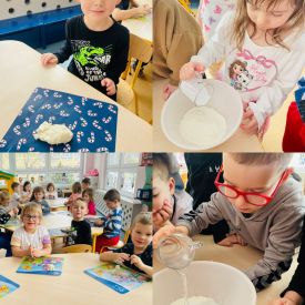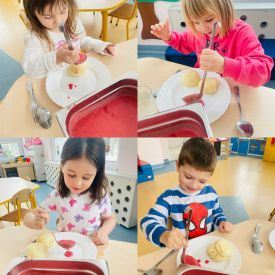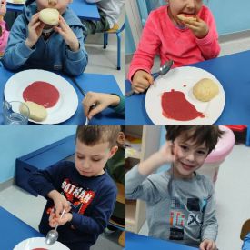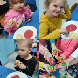 Nie zabrakło również zajęć kulinarnych, które sprawiły dzieciom wiele radości. Przedszkolaki miały okazję samodzielnie skomponować posiłek, którego głównym składnikiem był sos truskawkowy.