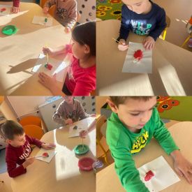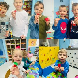 W ramach projektu "Kreatywne Dni Nietypowe" grupy Niezapominajki oraz Różyczki obchodziły radosny i bardzo smakowity Dzień Truskawki. Podczas zajęć plastycznych dzieci lepiły truskawki z plasteliny, rozwijając sprawność manualną i wyobraźnię. Przedszkolaki samodzielnie przygotowały masę solną, z której formowały truskawki, a po wyschnięciu z ogromnym zaangażowaniem malowały swoje prace, nadając im piękne, intensywne kolory.