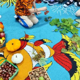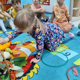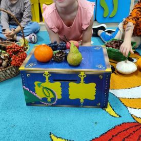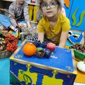 Z ogromnym zaciekawieniem oglądały skarby jesieni: czerwoną jarzębinę, kasztany, orzechy, a także soczyste owoce, które mogły dotknąć, powąchać i posmakować. Rozwiązywały jesienne zagadki i rebusy, tworzyły kompozycje z liści, brały udział w konkursach oraz prostych doświadczeniach. Z przyniesionych darów powstał piękny i bogaty kącik przyrodniczy, który jeszcze długo będzie cieszył nasze oczy.