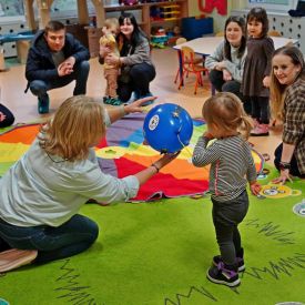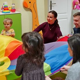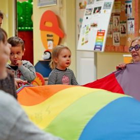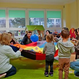 Maluchy uczestniczyły w zabawach integracyjnych z wykorzystaniem chusty animacyjnej, brały udział w zabawach badawczych oraz aktywnościach muzyczno-ruchowych. Nie zabrakło również wspólnych tańców i zabaw w kole, które sprzyjały budowaniu poczucia bezpieczeństwa oraz miłej atmosfery. Goście mieli możliwość zwiedzania sal dydaktycznych, zapoznania się z wyposażeniem przedszkola oraz obejrzenia pomocy edukacyjnych wykorzystywanych podczas codziennych zajęć. Nauczyciele udzielali odpowiedzi na pytania dotyczące adaptacji, organizacji dnia oraz oferty edukacyjnej.
