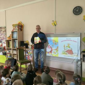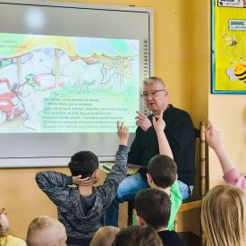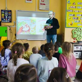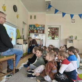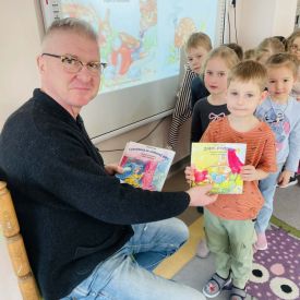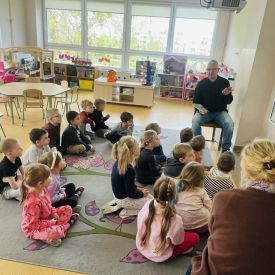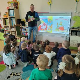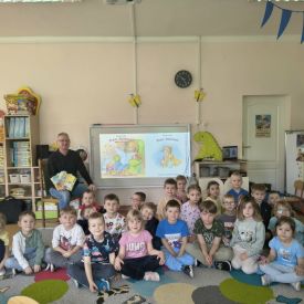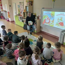 Dnia 24 kwietnia 2026 roku w naszym przedszkolu odbyły się wyjątkowe warsztaty czytelnicze, w których uczestniczyły wszystkie grupy przedszkolne. Naszym gościem był pisarz literatury dziecięcej – Robert Kuśta.