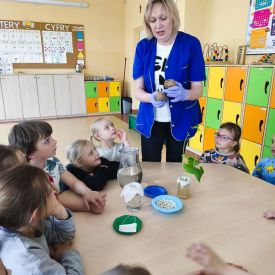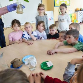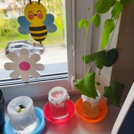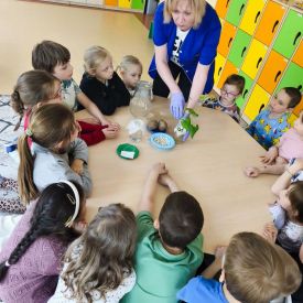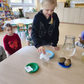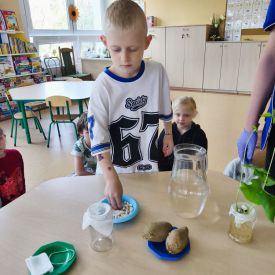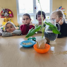 Zaczęliśmy od eksperymentu w sali. Każdy przedszkolak z niecierpliwością zagląda do słoików, aby sprawdzić: Co stanie się z ziarnem fasoli ułożonym na mokrej gazie?
