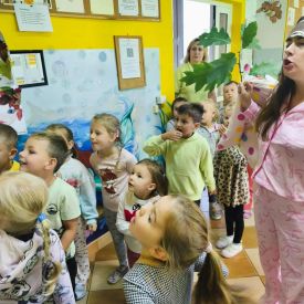 Myśleliśmy, że Pani Jesień przyjdzie w pięknej sukni i z koszem liści… A tu niespodzianka! Pani Jesień tak się zmęczyła rozdawaniem kolorowych liści, że przyszła do nas w… piżamie i zasnęła w schowku! Na szczęście przedszkolaki ją odnalazły, obudziły i mogły pokazać jej swoje piękne jesienne prace. Było dużo śmiechu i dobrej zabawy – taką jesień lubimy najbardziej !