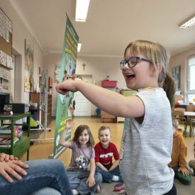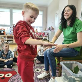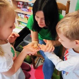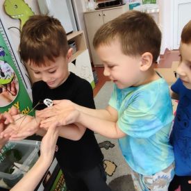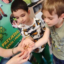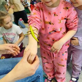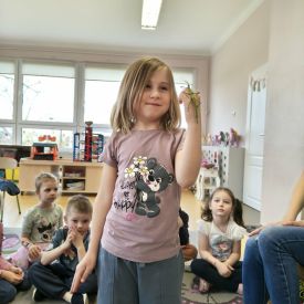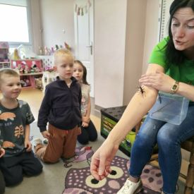 Ogromne zainteresowanie wzbudziły patyczaki i straszyki, które potrafią doskonale upodobnić się do gałązek i liści. Dzieci z zaciekawieniem obserwowały, jak trudno je dostrzec oraz dowiedziały się, w jaki sposób chronią się przed drapieżnikami.