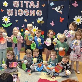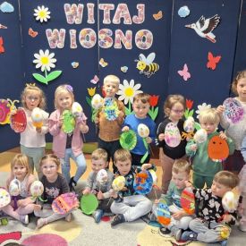 Po występie przedszkolaki wraz z rodzicami przystąpiły do części plastycznej. Wspólnie wykonywali wielkanocne pisanki – najpierw przestrzenne, zdobione techniką decoupage oraz kolorowymi wstążkami. Następnie dzieci tworzyły płaskie prace plastyczne w kształcie pisanek, wykorzystując różnorodne materiały, takie jak piórka, flamastry, pomponiki, kwiatuszki, cekiny, koraliki oraz plastelinę. Powstały niezwykle barwne i pomysłowe dzieła.