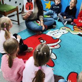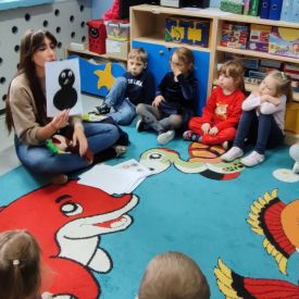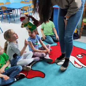 Podczas spotkania przedszkolaki w formie zabawy rozwijały swoje kompetencje językowe oraz doskonaliły poprawną wymowę. Wykonywały różnorodne ćwiczenia artykulacyjne, które wspierały sprawność aparatu mowy i pomagały w kształtowaniu prawidłowej realizacji głosek. Dodatkowo ćwiczyły język, usprawniając narządy mowy.